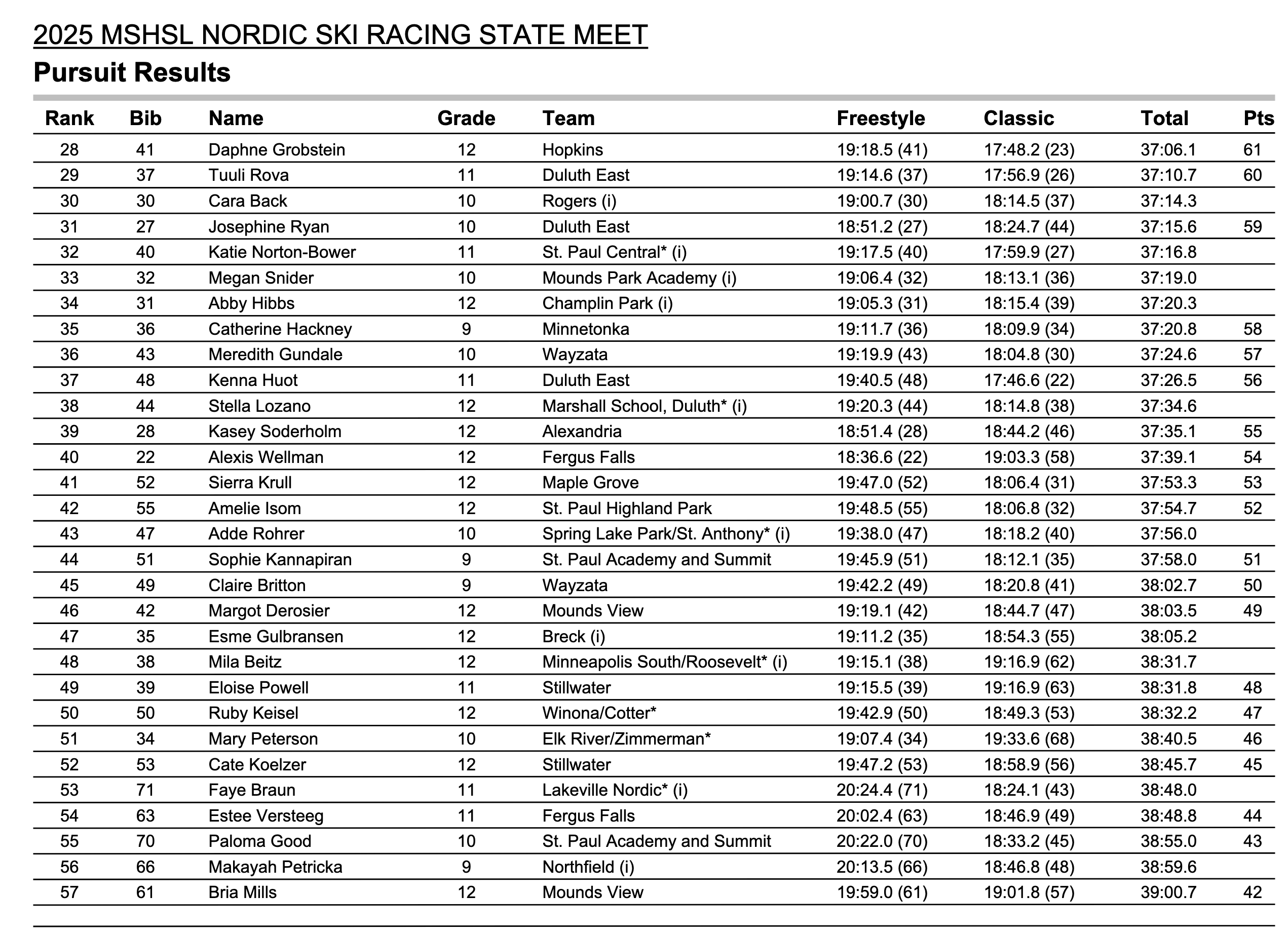 Mila Beitz finished 48th overall in the girls pursuit. Dylan West finished 23rd overall, making the all-state team (top 25 skiers). His time in the second half (pursuit portion) was 10th overall.